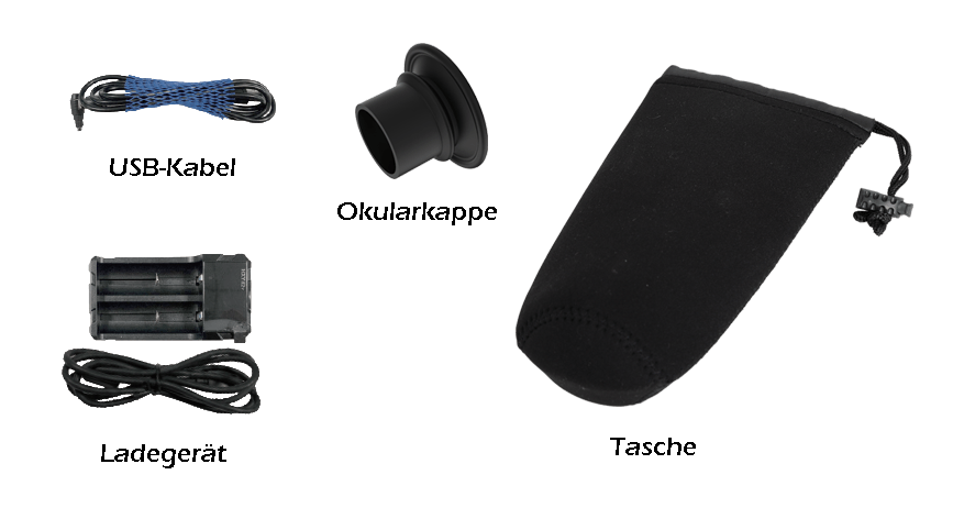 | Standardlieferumfang | Okular-Aufsatz, Aufbewahrungstasche, Ladegerät, 7-poliges Lemo zu USB Kabel |